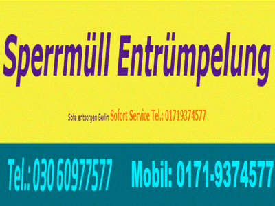 Wenn der Kunde uns telefonisch Entrümpler Sperrmüll Möbelentsorgungen Berlin kontaktiert, können telefonisch alle Details zur Sperrmüllabholung sofort 24 Std. von Sperrmüll in besprechen. Es wird preiswert sein.